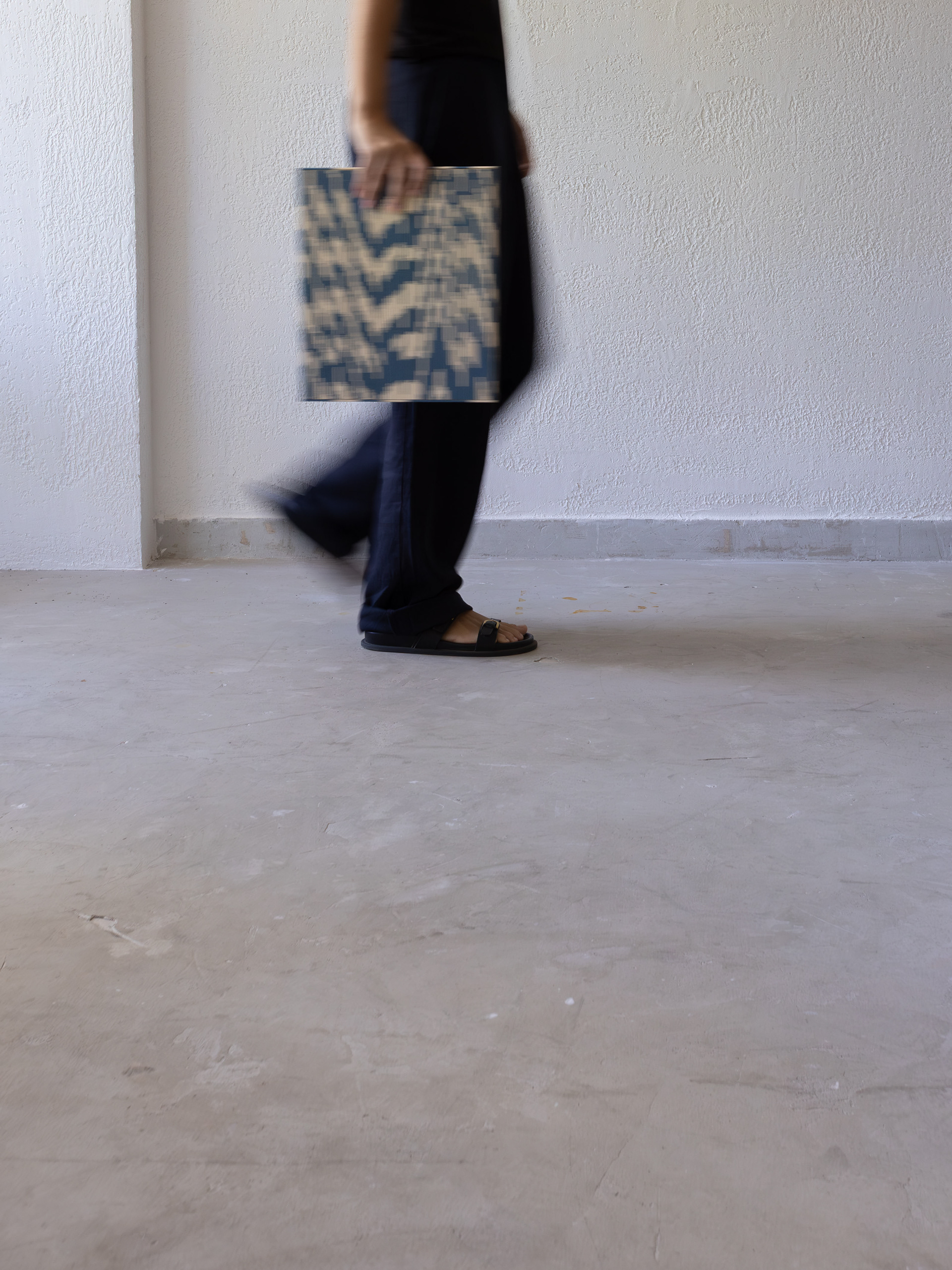 Entre esculturas em madeira, objetos encontrados e pinturas de grande escala, seu trabalho constrói uma geometria instável, que expande e contrai, cria vertigem e desloca o olhar. Repetição, ritmo e deriva atravessam sua produção, em um processo contínuo de acúmulo e reorganização.